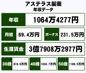 アステラス製薬の年代別の平均年収では、転職サイトや社員の口コミサイトなどが発表したデータを総合すると、20代が「約750万円」、30代が「約850万円〜900万円」、40代が「約1000万円〜1100万円」、50代が「約1200万円」ほどとなっています。