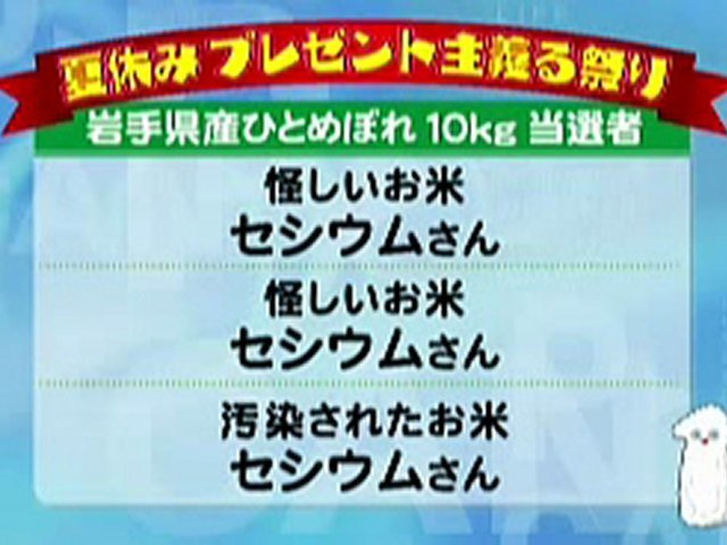 こちらの騒動については、放送事故後に「ぴーかんテレビ」にて「岩手県産ひとめぼれ」の正しい当選者が発表されたものの、その手書きフリップの文字を斜め読みすると「セシウム」になるという話題でした。