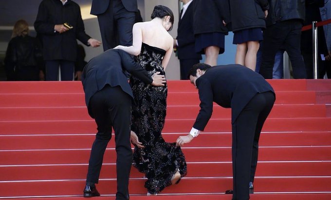 佐々木希さんが2016年に映画祭に行ったときと同じものを着ています。唐田さんと同じぐらいの身長の佐々木希さんは、階段を登るときは自分でスカートを持ち裾をあげ、エスコートも手をとってもらう程度でとどめていたそう。