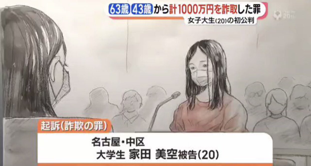 家田美空(いえだ・みく、名古屋市の大学生、逮捕当時20歳)は、2023年3月から5月にかけて、マッチングアプリで知り合った男性2人から複数回にわたって合計1065万円の金銭を騙し取ったとして逮捕され名古屋地裁で有罪判決を受けた女です。