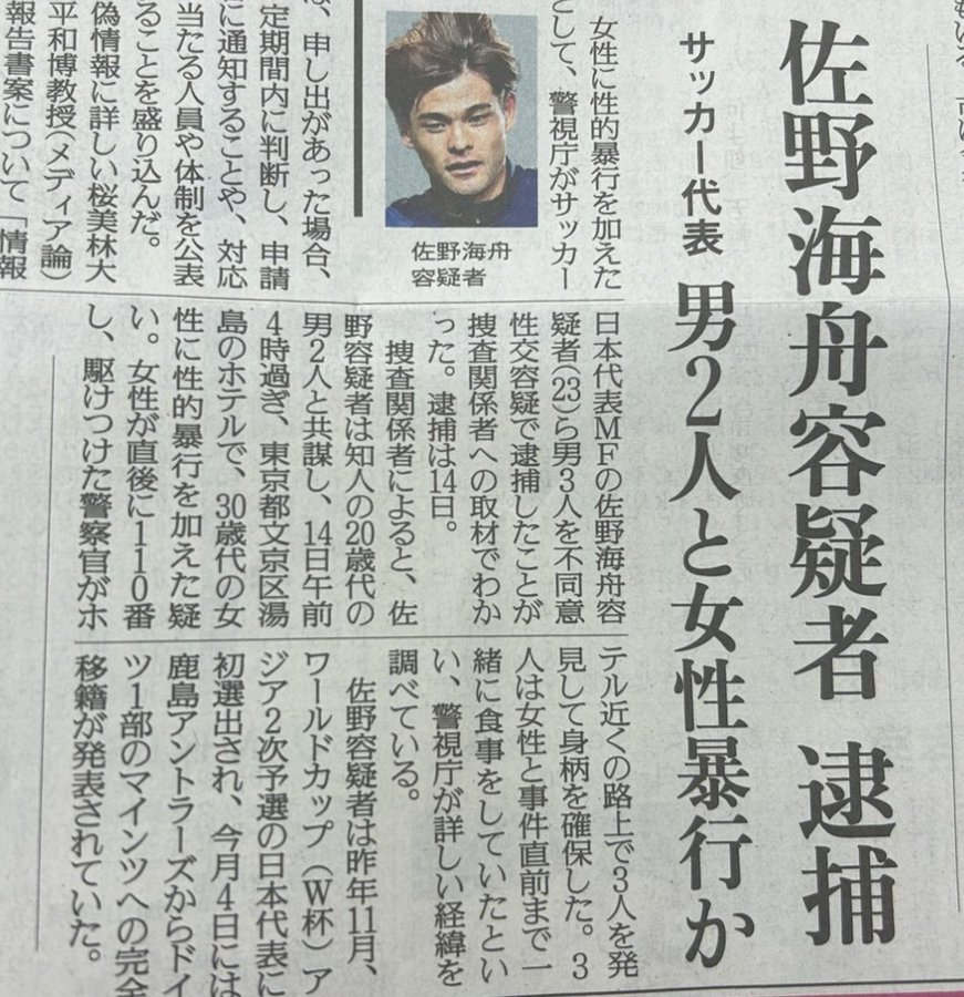 引用:サッカー日本代表・佐野海舟容疑者が性的暴行・逮捕、高校時代には“合コン謹慎” 関係者は「またコンパかよ、というのが正直な気持ち」(2ページ目) | 週刊女性PRIME