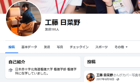 自己紹介欄に「日本赤十字北海道看護大学 看護学部 看護学科に在学していました」と記載された「工藤日菜野」という名義のFacebookアカウントも確認されており、アカウントに掲載されている顔写真がメディアが公開している工藤日菜野さんの顔写真と一致しています。