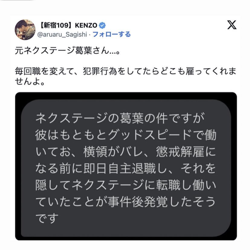 この事件を表に出すきっかけを作った「KENZO 【新宿109】」のXも、葛葉啓介容疑者の逮捕を速報として投稿していました。