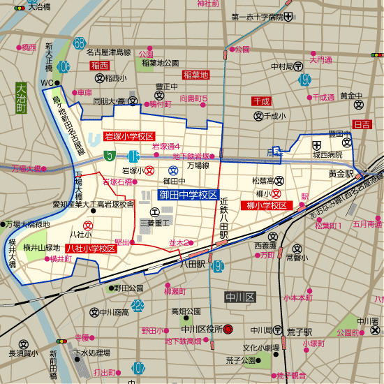 この中学の学区は名古屋市中村区内の以下の範囲となっています。