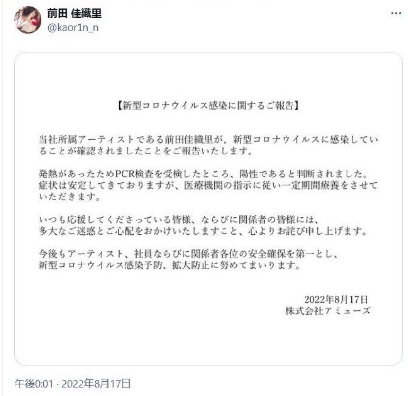 その翌日に、前田佳織里さんの新型コロナウイルス感染が発表されました。
