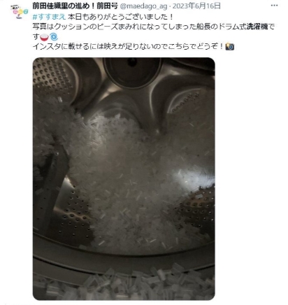 その約1ヶ月後、前田佳織里さんはXにて、洗濯機がクッションのビーズまみれになったとして画像を投稿しています。