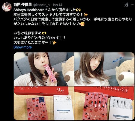2025年1月15日、前田佳織里さんは自身のXアカウントにて、「高濃度水素ゼリー」を紹介する投稿を行いました。
