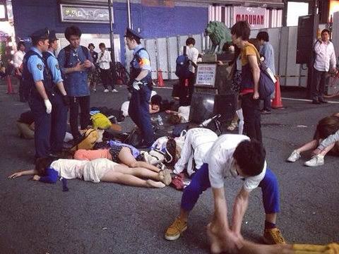 「倒れている女性たちは彼らの呼びかけに反応しないどころか、嘔吐を繰り返したり、失禁して道路にシミを作っている女性や、パンツ丸出しで大きい方をしている人もいて、ニオイも臭くて異様な光景だった」