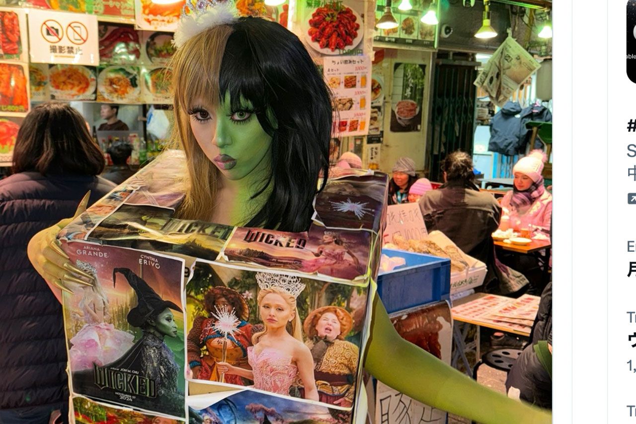サニバニさんは、2025年2月19日のTOHOシネマズ日比谷での映画「ウィキッド ふたりの魔女」ジャパンプレミアイベントに緑色のボディペイントのコスプレをして赴いた様子をSNSに投稿しました。
