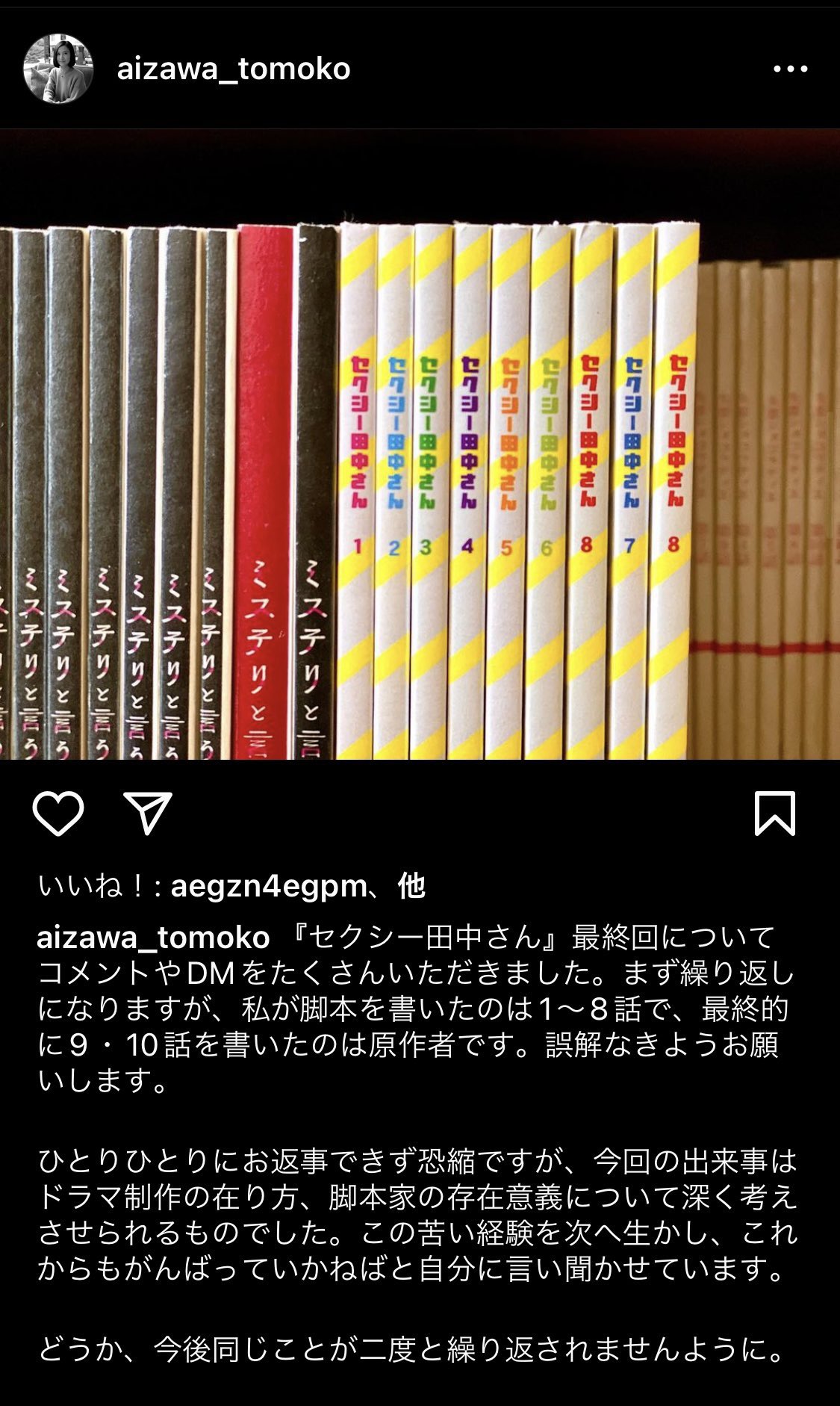 相沢友子さんは、ドラマ版「セクシー田中さん」の脚本を担当されていましたが、9話と10話は原作者である漫画家の原作者が担当したことを明かし、9話と10話に違和感があるという声が視聴者から多く上がったのは、原作者が口出ししてきたからであると暗に示したのでした。