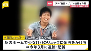 水藤翔太(すいとう・しょうた)被告は、2025年3月10日に名古屋市熱田区内の駅のホームで15歳の少女の背負うリュックに体液をかけたとする器物損壊で逮捕されその後起訴、さらに6月26日までに自身が教員として勤務する小学校の児童のリコーダーに体液を付着させたり、給食に体液を混入させたとする不同意わいせつと器物損壊などの罪で追起訴された逮捕当時34歳の小学校教員です。