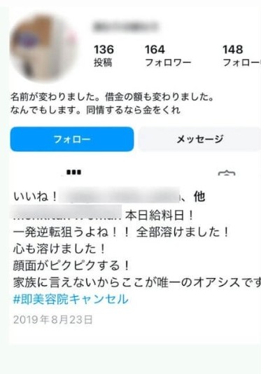他にもこの裏アカには、オンラインカジノを頻繁に利用している事や、全財産が835円しかない事、消費者金融の増額審査に落ちた事、金銭に困り副業としてアルバイトをしている事など自虐的な投稿が相次いでされていたようです。