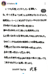 武尊は「格闘家としての最終章、これからは家族という存在も背負って戦って楽しい時も苦しい時も支え合いながら生きていきたいと思います」と伝え、川口も「これからは夫婦支え合いながら、より一層お仕事に全力で向き合ってまいります。今後とも変わらぬ応援をよろしくお願いいたします」とつづるとともに、「そしてお誕生日おめでとう」と同日誕生日を迎えた武尊を祝福している。